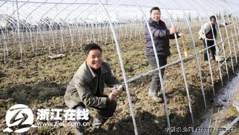 2月1日,东阳市城东街道单良村蔬菜基地,菜农李建华一家正在搭建大棚。
