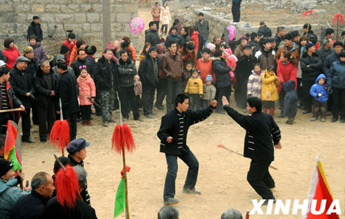 1月31日,在河北省井陉县北固底村,一支表演队在进行武术表演。
