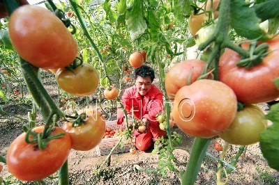 2月2日,江苏省赣榆县沙河镇颜庄村延聪蔬菜合作社菜农在 "猪-沼-菜"温室大棚里采摘无公害西红柿。