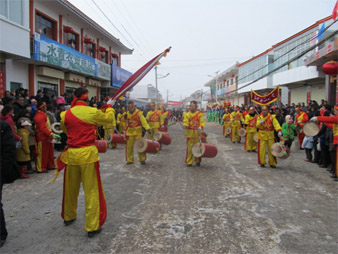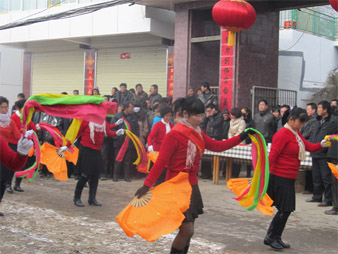 火红的秧歌舞起来。身着色彩鲜艳服装的队员们,手持彩扇、花手绢,和着欢快的鼓声、锣声,扭动腰肢翩翩起舞,脸上全是欢快的笑容,憨态可掬的大头娃娃活灵活现的表演更是令人捧腹大笑,欢快的气氛让原本寒冷的冬季变得异样火热。