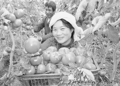 图为该县平明镇农业资源综合开发项目区社员彭金君和妻子张艳娟采摘无公害西红柿。