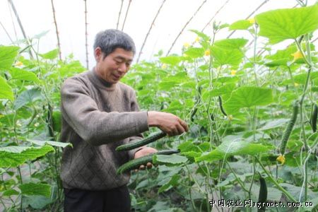 邱振胜在大棚里采摘黄瓜