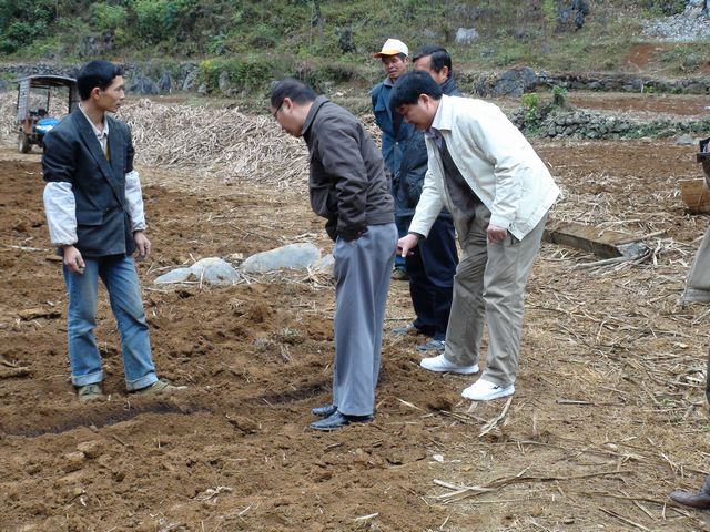 巴马县农业局韦明福局长(右)带领农业技术人员深入田间地头指导春耕生产