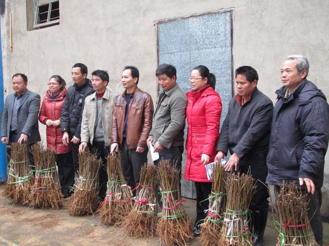2月2日,年味未过,荔浦县农业局大院内,迎来了9位基层农技推广体系科技示范户,他们正高高兴兴的领取果苗新品种――油桃瑞光51号。该品种是自治区农业厅从北方引进适合南方种植的一个桃类品种,荔浦县农业局免费发放给科技示范户试种,发苗前水果专家对该品种特性、种植技术要求和注意事项进行了讲解,并把有关知识打印出来,分发给他们。农业局党组书记邓品恒、副局长吴德萍、纪检组长陆月梅等领导现场指导。图为科技示范户们领取果树苗现场照。