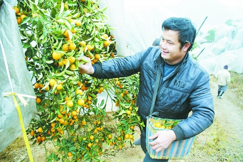 近日,阳朔县白沙镇观音山村村民正在采摘金桔。春节以来,阳朔金桔大面积成熟,市场价在6至12元每公斤。目前,该县白沙、普益9个乡镇金桔种植面积达11万亩,年产值达10多亿元。