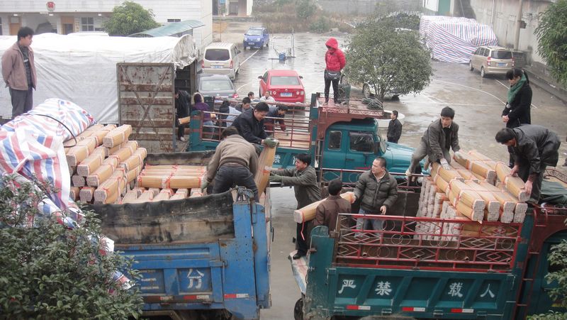 图为蚕农正在把方格簇装上车