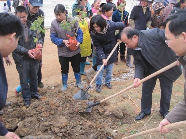 为深入推进“绿满八桂”造林绿化工程建设、创建国家森林城市,充分调动广大农民群众种植珍贵树种的积极性,加快兴宁区珍贵树种发展步伐,改善农村生态环境,促进农民增收致富,推进社会主义新农村建设,2月3日上午,兴宁区各镇同时举行“千万珍贵树种送农家”活动启动仪式,兴宁区人民政府曹建喜副区长、区委组织部黄小萄副部长、农林水利局陆祖腾副局长、各镇分管副镇长等领导参加了活动,共有200名干部职工、250名村民参与,种植珍贵树苗1500棵。在活动现场,曹副区长亲手将珍贵树苗黄花梨600株赠送给五塘镇四平村朝阳坡村民,并和村民一起开展植树活动。