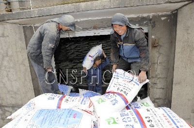 2月9日下午,浙江东阳市方圆农资连锁配送中心内,装卸工人在忙着把配送的化肥装车。