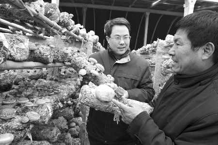 灵宝市阳店镇东水头村党支部书记(右一)与灵宝市教体局派驻该村的第一书记郭苏成查看标准化香菇反光大棚里香菇的生长情况。2010年,该村建起了5座香菇反光大棚,并成立了灵宝市沁源香菇专业合作社,现发展社员11户,带动当地20多户群众发展香菇种植新模式,占地1亩的香菇大棚,年收入达10万余元。