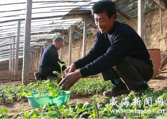 昨日,气温有所回升,宋村镇蔬菜基地的菜农们开始抓紧种植春季大棚蔬菜。图为当日大泽头村村民刘昌礼在自己家大棚内移栽黄瓜苗。