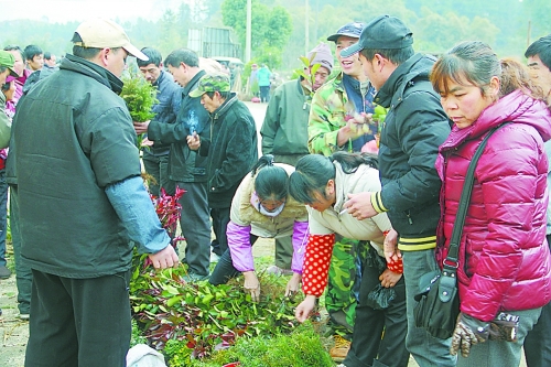 元宵节刚过,浓浓的年味还未散去。2月2日,正值灵川县潭下镇的圩日,位于灵青公路旁的树苗销售一条街已是人头攒动,街道两旁摆满了银杏、柑橘、柿子、板栗、桂花、杉树、罗汉松等数十种优质树苗,吸引了大批前来赶圩的群众抢购,以争抢农时种下龙年第一棵致富树。图为一果苗摊前围满了抢购果苗的村民。
