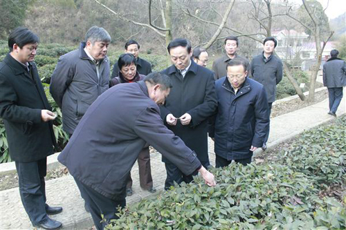2月8日,省委常委、副省长余欣荣一行到六安市裕安区,就六安瓜片发展情况进行实地调研。余省长一行首先考察了安徽徽六六安瓜片茶叶公司茶叶工厂,察看了茶叶化验室、分拣室、烘焙间、仓储物流中心等生产车间,详细询问了六安瓜片生产对品种、产地环境、加工工艺等要求以及六安瓜片色、香、味、形等特征,尤其是对六安瓜片产品标准、质量检测情况进行了深入细致的了解。在听取徽六茶叶公司曾胜春董事长汇报后,余省长语重心长地说,六安瓜片是我国十大传统名茶之一,要做大做强这一品牌,首先要进一步树立标准意识、质量意识,质量就是企业的生命。在保证质量的基础上,要扩大规模,不断提高品牌的规模效益。要根据国家、国际标准要求,按照茶叶生产核心区、主产区、辐射区不同区域,确定划分茶叶等级和质量标准。通过建立健全六安瓜片质量标准体系,按标准组织生产、加工、包装等,不断提高茶叶产品质量,满足国内外市场的需求。随后,余省长一行又到徽六六安瓜片生产核心区独山镇南焦湾村磨剑冲,登上海拔800米的山头,对1000亩连片生态茶园的生长环境赞不绝口。下山后又走访了裕安区磨剑冲名优茶专业合作社负责人,得知随着六安瓜片品牌影响力不断扩大,近年来价格以20%的速度增长,高档茶增长50%的情况非常高兴,随即赋诗一首: