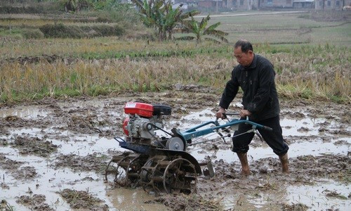 侨乡容县的农民群众立足今年春天雨水充足的有利条件,积极开展备耕备种工作,许多农户使用“汽牛”加快春耕生产进度。图为灵山镇华?村一位老农在使用“汽牛”耙田。