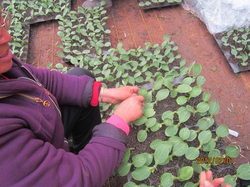 从1月29日(正月初七)开始截止2月8日为止,岐山县农技中心抽调五名技术人员在杨玉萍副主任的带领下对全县凤鸣镇太子村、八角庙村、南郭村,故郡镇西塬村、郑家桥村,雍川镇袁子头村、马江村,蔡家坡宋家尧村,枣林镇北营村,京当镇京当村瓜菜育苗点情况进行了逐村逐示范点检查和技术指导,从检查和指导的结果看,今年各个育苗点都顺利地战胜和度过了今年1月21日罕见大雪和持续低温寡照天气,各点繁育的瓜菜幼苗长势良好,嫁接成活率85%以上,嫁接工作已于昨天全部结束,嫁接较早的雍川镇马江村、袁子头村西瓜已长出1-2片真叶,其它各点瓜苗已基本成活,今年的瓜苗可以完全保证我县大棚生产需要。另外在宋家尧和郑家桥还繁育了甜瓜苗、西红柿苗等长势整齐一致。