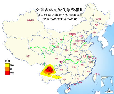 预计,2012年2月14日20时至2月15日20时,四川南部、云南中北部和东南部、广西西北部森林火险气象等级较高,其中,四川南部、云南北部的部分地区森林火险气象等级高,局部地区森林火险气象等级极高,请各有关单位严加防范,严禁一切林内用火,确保林区安全。