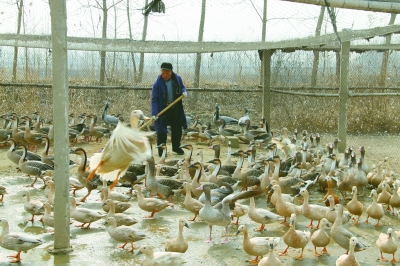 图为2月12日房山镇特种养殖场工人在打扫野鸭场。