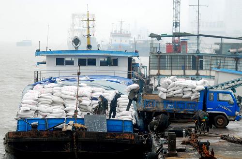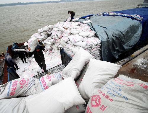 2月15日,在江西九江港码头,工人将货船上的化肥卸运到汽车上。新华社发(胡国林 摄)