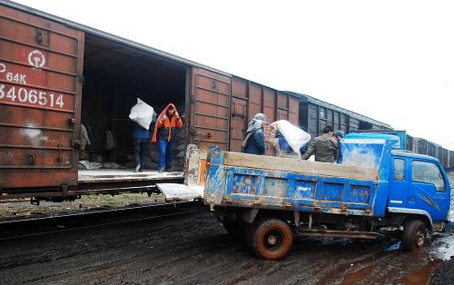 2月15日,在江西九江北车站,工人们将化肥装运到火车上。新华社发(胡国林 摄)