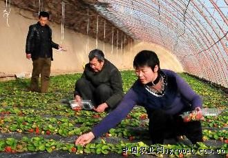 2月22日,内蒙古巴彦淖尔市五原县隆兴昌镇农民张丽萍(右)和家人在温室大棚内采摘草莓。她家共种植设施草莓1亩,年产1500公斤,收入近10万元。近年来,在一系列设施农业和特色农业政策的扶持和鼓励下,内蒙古巴彦淖尔市农民转变种植观念,将过去耕种的大田改造为日光温室大棚等设施农业基地,种植设施草莓,每亩年收入可达10万余元,进一步带动当地农民增收致富。