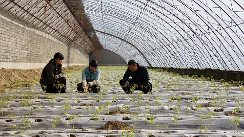 2月23日,内蒙古包头市九原区农业技术推广人员吴振军(右)在对当地农民进行大棚芹菜种植技术指导。