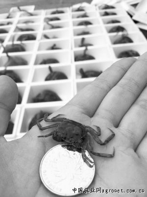 据了解,这批蟹苗来自长江,又在阳澄湖里住了1年左右,前晚刚运到宁波。在投放现场,蟹苗被分装在50个泡沫箱里,共计20多万只,约有300公斤重,1只的个头大小与1元硬币相近。