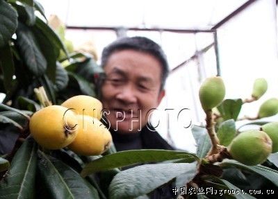 2月26日,浙江省玉环县干江镇“老爸果园”的陈祝雷正在枇杷温室大棚内查看枇杷的生长情况。他介绍,今年虽是低温,但是他家的20来亩温棚枇杷丰收在望,预计在3月底4月上旬可大量上市,比露天枇杷早二个月,有望增收。上世纪80年代,陈祝雷率先让西瓜住进农膜大棚,又经过五年摸索,终于掌握了在低温情况下,使枇杷不挨冻、外表不出现斑状、产量提升、品质高的一套有效种植技术。