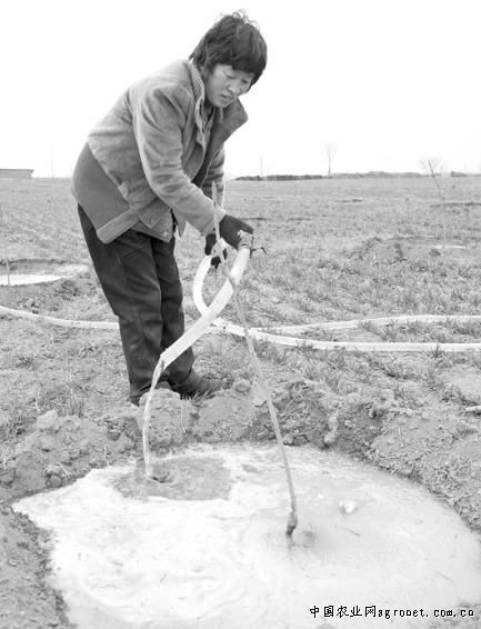 2月24日,孟津县麻屯镇杨岭村农民浑丽萍在为刚刚栽种的樱桃树苗浇水。为增加农民收入,该村引进大樱桃新品种,现已发展大樱桃800多亩,栽种樱桃树苗2.3万株。樱桃进入盛果期后,每亩纯收入可达2万余元。