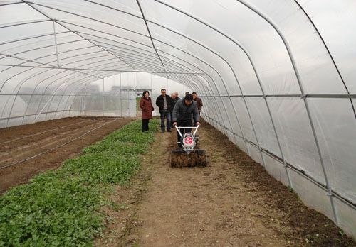 图为东社镇新桥立体种养殖基地购置的大棚王和田园管理机