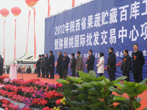 2月29日,眉县迎来了猕猴桃产业发展又一盛会,由陕西省农业厅、宝鸡市人民政府主办,中共眉县县委、眉县人民政府承办的2012年陕西省果蔬贮藏百库工程暨猕猴桃国际批发交易中心项目启动仪式在眉县隆重举行。陕西省农业厅厅长王宏、陕西省农机局局长,省财政厅、省果业局、省发改委分管领导,及宝鸡市市长上官吉庆、中共眉县县委书记李智远、眉县人民政府县长孙敬虎等出席了项目启动仪式。会上,省农机局局长做了重要讲话,环球园艺公司公司总裁,合作社代表先后做了发言。最后,省农业厅厅长王宏宣布项目正式启动。眉县级涉农部门、乡镇主要负责同志;猕猴桃基地村村干部,相关合作社负责人等1000多人参加了会议。