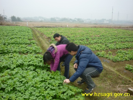 元月份以来持续的低温阴雨天气对我市的冬春种马铃薯造成一定的影响,导致部分马铃薯出苗缓慢,长势较弱。为进一步了解当前马铃薯生长情况,提出科学、严谨的管护措施,有针对性地指导农民做好当前马铃薯田间管理工作,贺州市农业局技术员近日深入全市多个马铃薯基地对生产工作进行检查和指导。2月13日,贺州市农技站站长、高级农艺师何燕带领该站技术员一共4人来到八步区贺街镇香花村进行田间调查,该基地早种的马铃薯已封行,也有部份稍迟种的正在陆续出苗,由于当天天气转晴,气温回升,田间有农民对已齐苗田块的马铃薯进行培土。何燕等农技员向农民详细地咨询了在种植马铃薯过程中出现的问题和管理难点,并当场对农民进行田间管理技术指导。农技员指出,由于该基地为分散管理为主,每户农民的管理水平极不一致,而长期的低温天气造成植株长势较弱,天气回暖后极容易感染晚疫病等病害,因此一定要根据自己田块马铃薯长势的具体情况做好肥水管理和防病、培土等工作,在施药时可加入0.3%磷酸二氢钾溶液等叶面肥进行叶面追肥,对于已封行但因为施肥过多和光照少等因素影响出现植株徒长的田块,可适当喷施多效唑进行控苗。