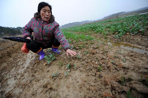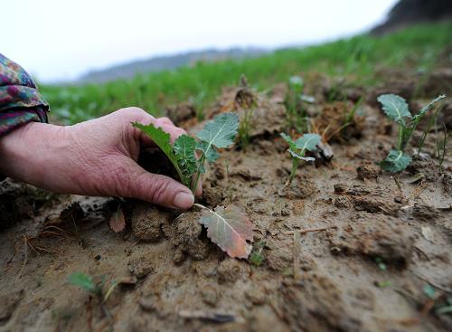 江西都昌县汪墩乡庆胜村农民黄淑芳家种植的油菜生长缓慢,部分已经烂种死苗(3月6日摄)。