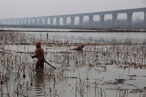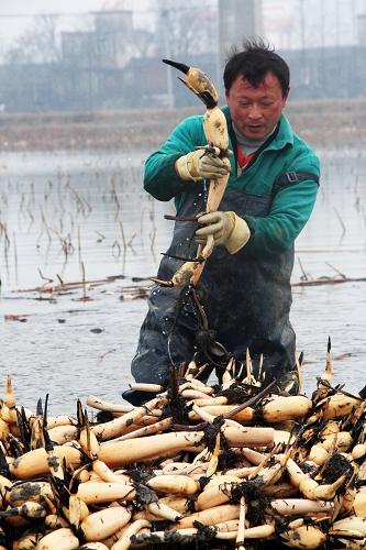 3月5日,一名藕农将生长成熟的“无私藕”拔出土壤。