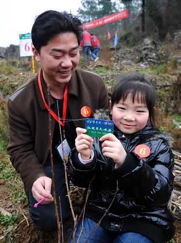 3月12日,一名小游客将标识卡挂在栽种的果树上。标识卡用于建立果树网络档案,游客可以通过网络了解自己栽种的果树成长情况。