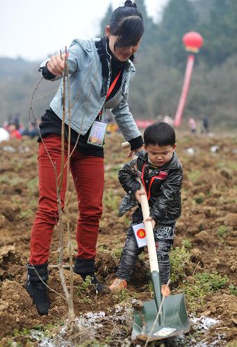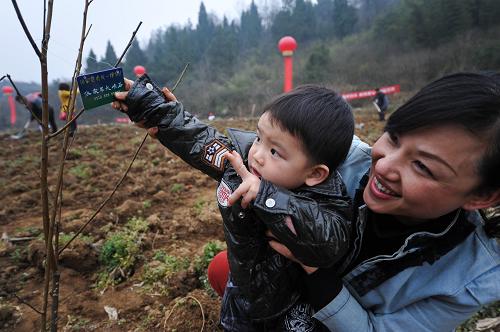 3月12日,一位女游客抱着孩子将标示卡挂在刚栽植的果树上。标识卡用于建立果树网络档案,游客可以通过网络了解自己栽种的果树成长情况。