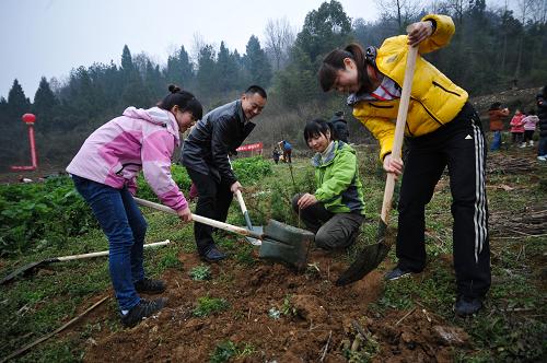 3月12日,4名游客在栽植果树。