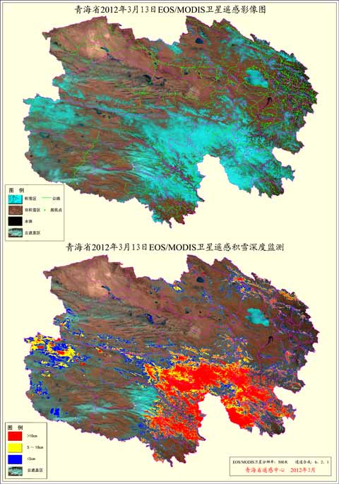 根据3月13日的EOS/MODIS卫星遥感监测显示,目前青海省积雪面积约18.98万平方公里,占全省行政区域面积比例为18.09%。积雪主要分布在玉树州和果洛州,积雪面积分别约8.05万平方公里和5.96万平方公里;海西州积雪面积约2.41万平方公里;黄南州、海南州和海北州积雪面积在5514.5~9323.75平方公里之间;西宁市和海东地区积雪较少,积雪面积在1702平方公里以内。