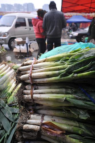 3月19日,太原市河西农副产品批发市场商户在销售大葱。当日,记者在太原市河西农副产品批发市场了解到,由于今年大葱种植面积减少,再加上近期气温下降,产量降低引发供求失衡导致大葱价格持续上涨,大葱零售价从春节期间的1元多一斤涨到现在的4元一斤。而“田间地头――大葱经纪人――蔬菜批发商――蔬菜批发市场――菜市场――市民餐桌”的冗繁流通环节也助推葱价上涨。