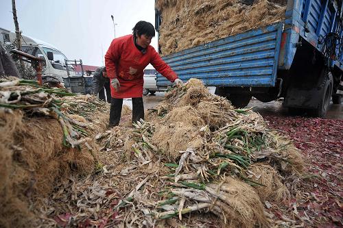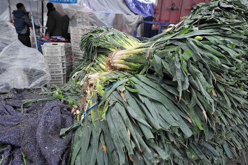 3月19日,在太原市河西农副产品批发市场,一位蔬菜批发商在搬运大葱。