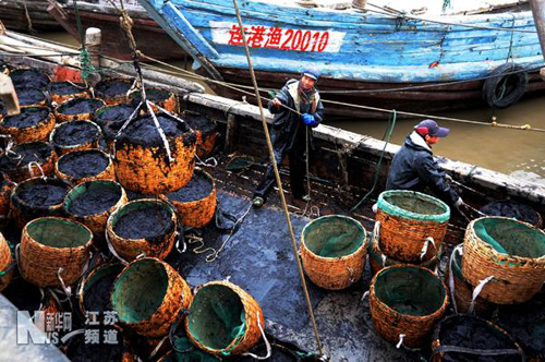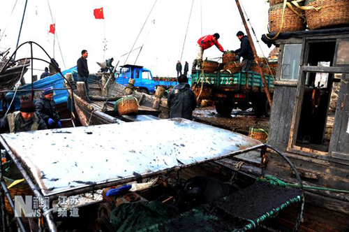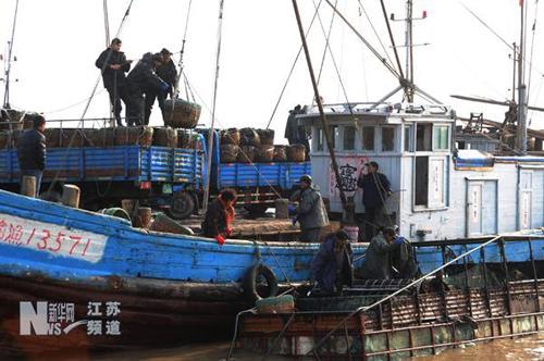 连云港西墅村沿海紫渔民将刚刚收割的新鲜紫菜卸船装车,准备运往加工厂。