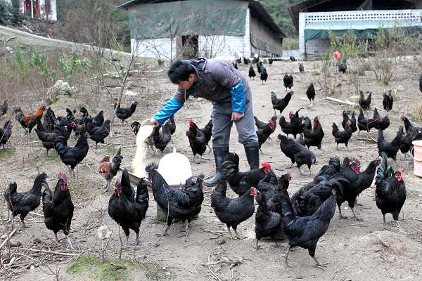 绿壳蛋鸡,具有“五黑一绿”的特征,即黑毛、黑皮、黑肉、黑骨、黑内脏,所产鸡蛋却是绿壳,集天然黑色食品和绿色食品为一体,是世界罕见的珍禽极品。该鸡种产蛋量较高,具有明显高于普通家鸡抗御环境变化的能力,目前市场上供不应求。图为红沙养殖场管理员在给绿壳蛋鸡喂食。