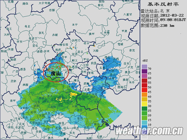22日凌晨开始,降雨云系开始在北京以南的河北中南部旺盛发展。今天上午9点,降雨云系向北京的西部发展,一直蔓延到主城区西侧和延庆南部,不过9时30分前后开始,降雨云系再次向西南方向撤离,11时则主要集中在在房山区的西部地区,回波强度基本维持在10-25DBz,以短时降雨天气为主。