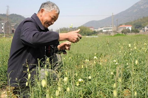 3月25日上午,浙江省舟山市定海区金塘镇仙居社区正在摘除“浙贝母”的花朵和防治灰霉病,以促进“浙贝母”根块的更好生长。