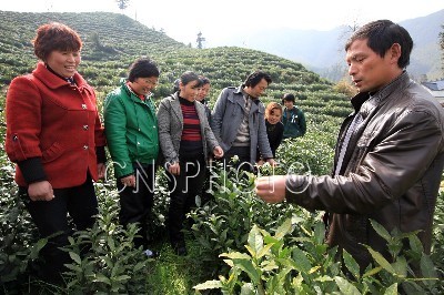 3月23日,安徽省黄山市黄山区新明乡三合村西二村民组组长刘宗华(右一)在茶园向茶农介绍管养方法。安徽省黄山市黄山区新明乡三合村是极品太平猴魁核心茶区,拥有5000余亩茶园,其中高效无性系良种茶园2000亩,年产13万斤以上太平猴魁春茶,人均纯收入2万元以上。其中,猴坑村民组人均纯收入20万元以上。当地12个村民组,有450余户村民从事太平猴魁生产,村里拥有4个专业合作社和1个茶叶协会,今年以来,该村努力打造全国知名生态文化村,村容村貌得到飞速提升。