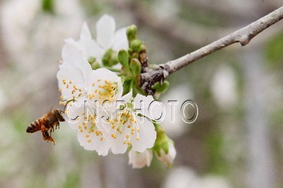 3月23日,江苏省赣榆县厉庄镇谢湖村樱桃大棚内一只蜜蜂在花间授粉。