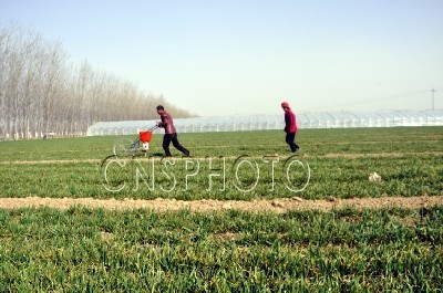 3月23日,山东茌平县贾寨乡郭堤口村农民郭连良夫妇趁雨后时机在给小麦追施化肥。近日,山东聊城地区普降春雨,平均降雨量为12.5~14.5毫米。降水缓解了去年秋、冬以来的旱情,对麦苗的生长发育极为有利,也为麦田春季管理创造了有利条件。