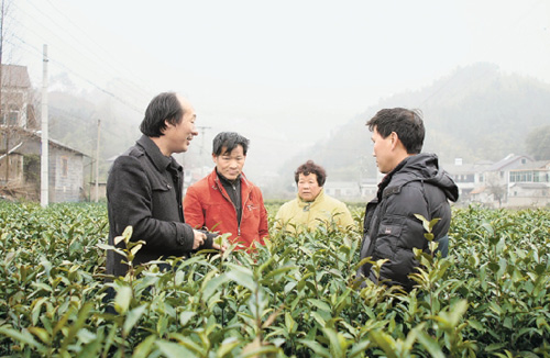石家坞茶园里,农业局专家与茶农交谈,了解情况。