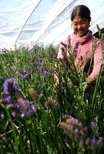 资料图片:2009年2月8日,西藏堆龙德庆县岗德林蔬菜种植农民专业合作社藏族妇女卓嘎在查看花卉生长情况。成立于2004年底的西藏堆龙德庆县岗德林蔬菜种植农民专业合作社,除了种植蔬菜外,大力推广花卉种植,并从2008年底开始出口到尼泊尔,目前已出口牡丹、康乃馨、勿忘我等花卉15万多支。去年,参加合作社的235户农民通过种植蔬菜、花卉,平均每户获得12500元的收入。