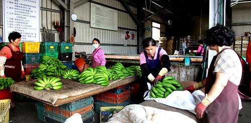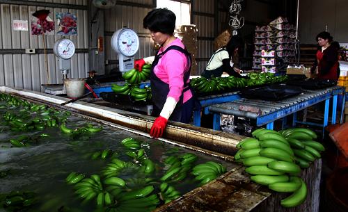 4月5日,女工在集货场分拣香蕉。台湾高雄旗山镇盛产香蕉,旗山香蕉每年外销150多万箱,总金额达到1亿多元新台币。其中,销往大陆的香蕉量已经占旗山香蕉外销量的30%。这其中,海峡两岸经济合作框架协议(ECFA)立下大功,台湾香蕉出口大陆关税从过去的15%逐步下降到今年的零关税。新华社记者 任沁沁 摄
