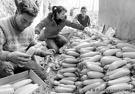 图为东海县“农事钟点工”正在高效农业园区把良种无公害韩国莴瓜装箱发往俄罗斯订单供应地。