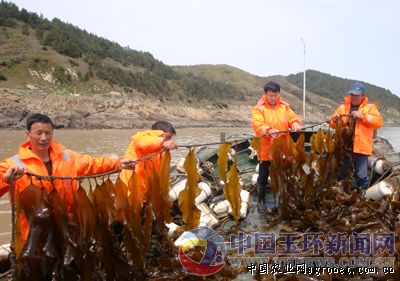 “这些海带是去年12月挂苗,养殖面积有300多亩,共投资70多万元。”近日,位于浙江玉环县中鹿岛附近海域养殖的海带喜获丰收,玉环县万丰水产养殖有限公司老总黄小祝高兴笔者,由于该海域远离大陆,水质好,没有污染,所以养殖的海带产量高,品质好,估计亩产干海带900公斤,总产值近150万元,一个月内将全部采收完毕。同时,今年年底,该公司还将养殖面积扩大到1000亩。